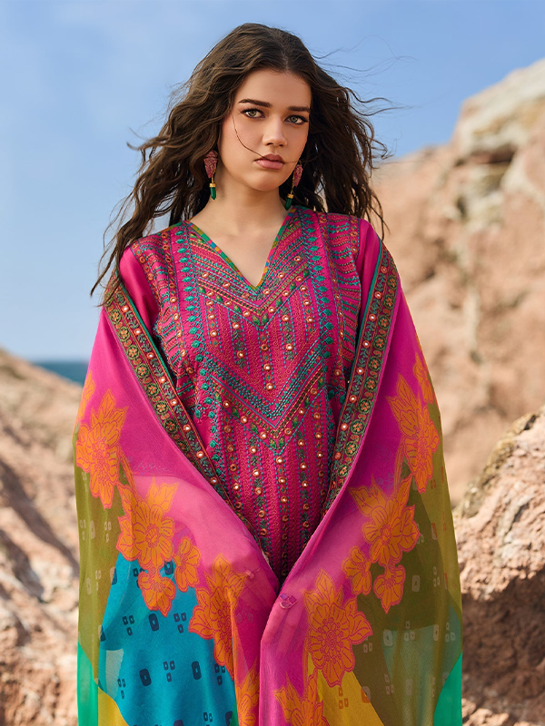 Add a touch of elegance to your look with this beautiful Skin coloured 3-piece unstitched lawn suit. Featuring an embroidered dyed lawn front with a stylish neck design, paired with printed back and dyed sleeves for a balanced and trendy vibe. Intricate daman, sleeves patti, and delicate motifs enhance the overall charm. Comes with a comfortable dyed cotton trouser and a stunning embroidered chiffon dupatta with a pallu patti, perfect for a graceful, classy outfit.