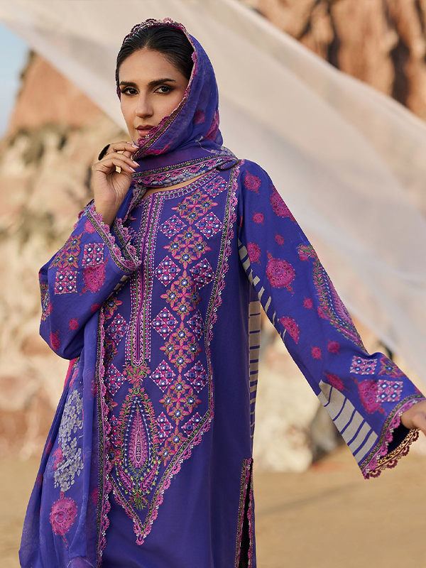 Elevate your style with this vibrant purple outfit featuring intricate embroidery on premium lawn front, printed lawn back and sleeves, dyed cotton trouser, and embroidered chiffon dupatta. Perfect for customization and making a statement.