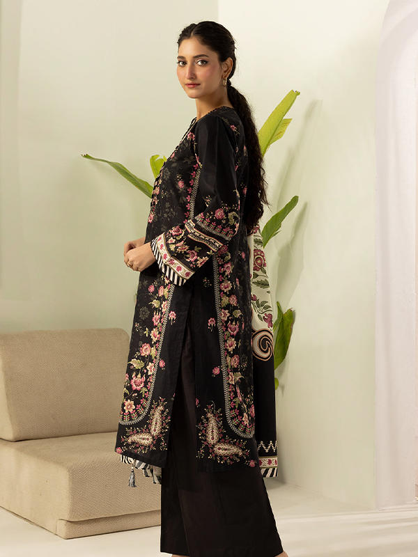 Turn heads with this stunning black outfit, beautifully adorned with delicate floral prints and detailed borders. Paired with a statement dupatta, this ensemble offers a perfect balance of grace and style, making it an excellent choice for evening wear and casual wear.