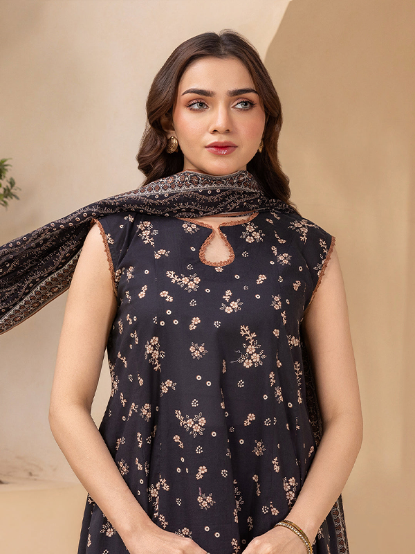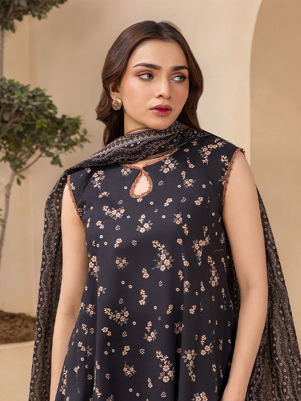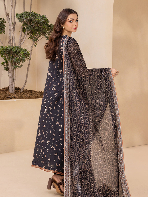 Add a touch of sophistication to your wardrobe with this elegant black printed 3-piece suit. The shirt features minimal yet classy motifs, paired with a gorgeously detailed dupatta that enhances the overall appeal. The matching trouser completes the outfit, making it a perfect choice for both casual and semi-formal wear.