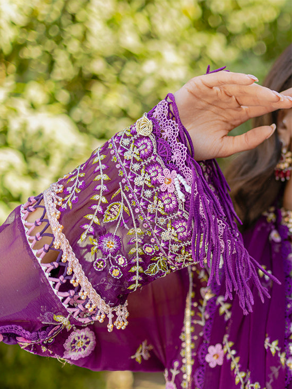 A luxurious purple three‑piece ensemble featuring a dyed embroidered bamber chiffon shirt with crepe silk inner lining, paired with a dyed embroidered bamber chiffon dupatta and dyed raw silk trousers.