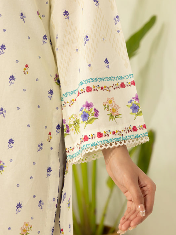A beautifully printed off white lawn suit featuring vibrant blue, yellow, and green floral patterns. Perfect for summer casual wear with a comfortable and chic appeal.