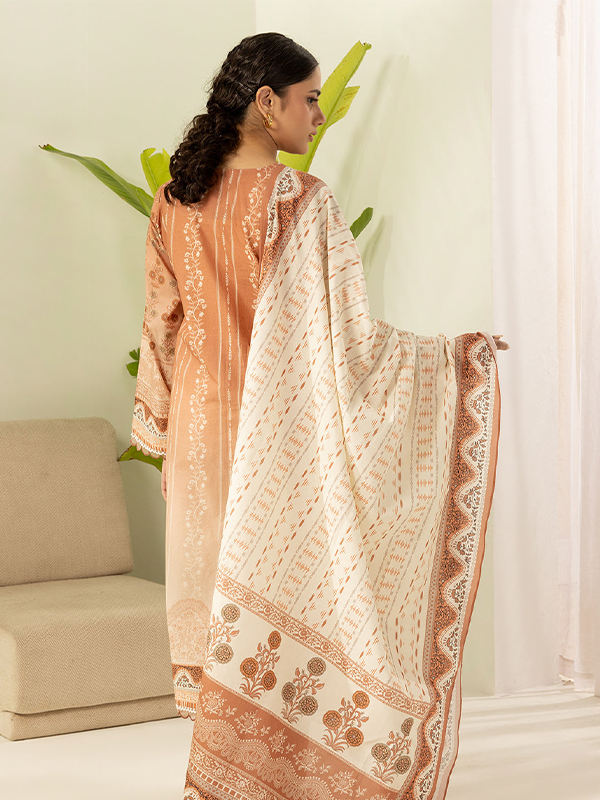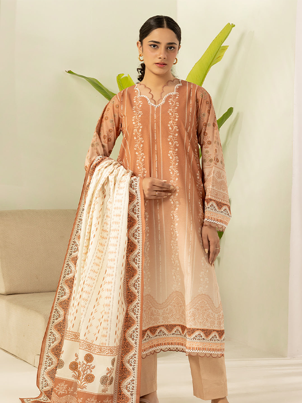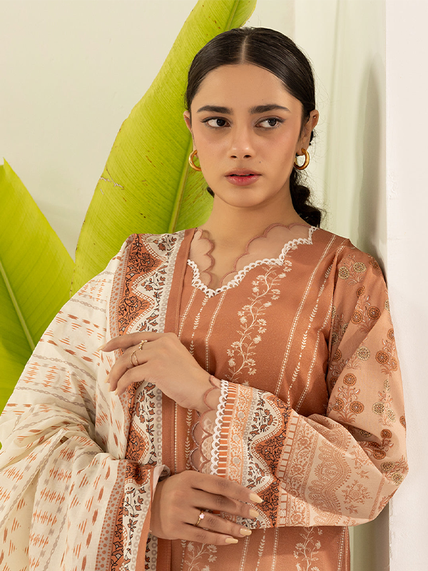 Step into summer elegance with this Rust 3-piece unstitched lawn suit, featuring a printed shirt, plain shalwar, and matching dupatta.